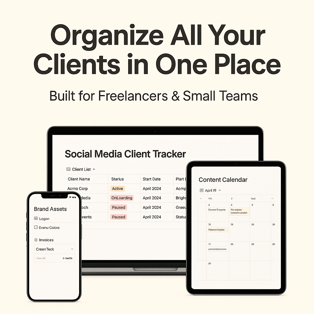 You’re getting a ready-to-use digital workspace that helps you manage clients, track content, store brand assets, organize invoices, and streamline communication — all in one place.
